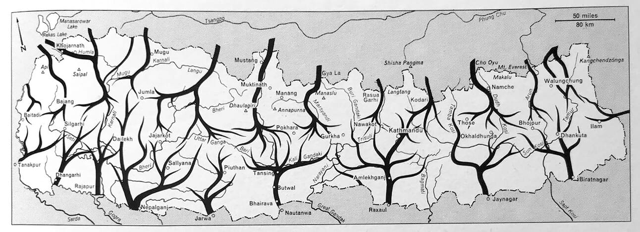 Salt and grain trade routes connecting Tibet and Nepal through the northern Himalayas.