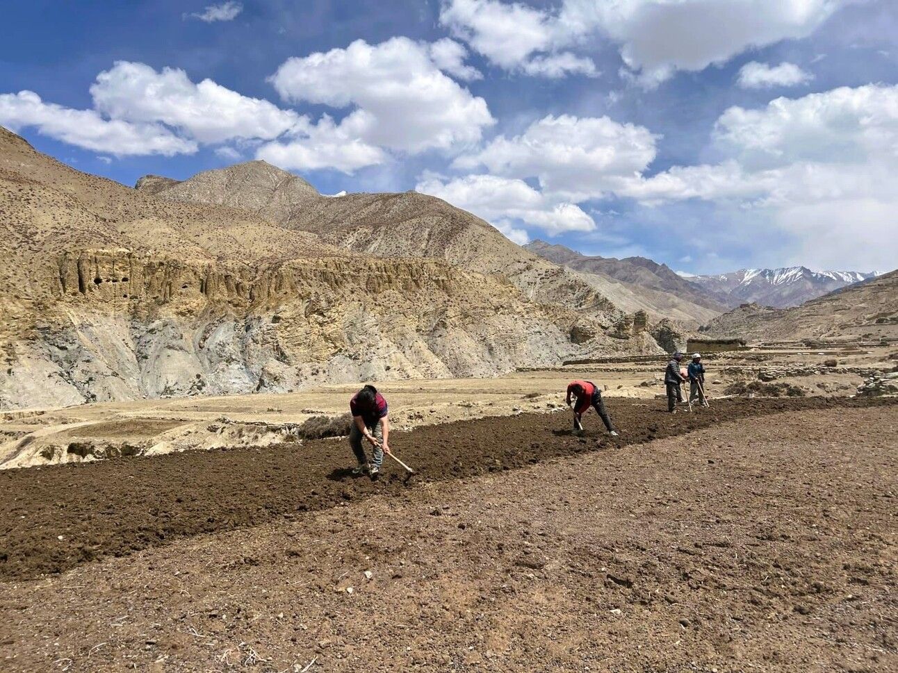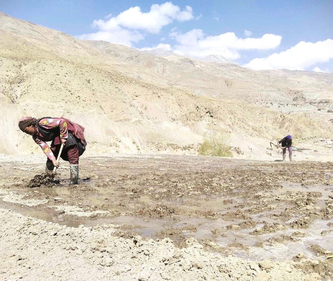 Women in Saldang village prepare fields for cultivation using traditional manual irrigation methods. Image: Tsering